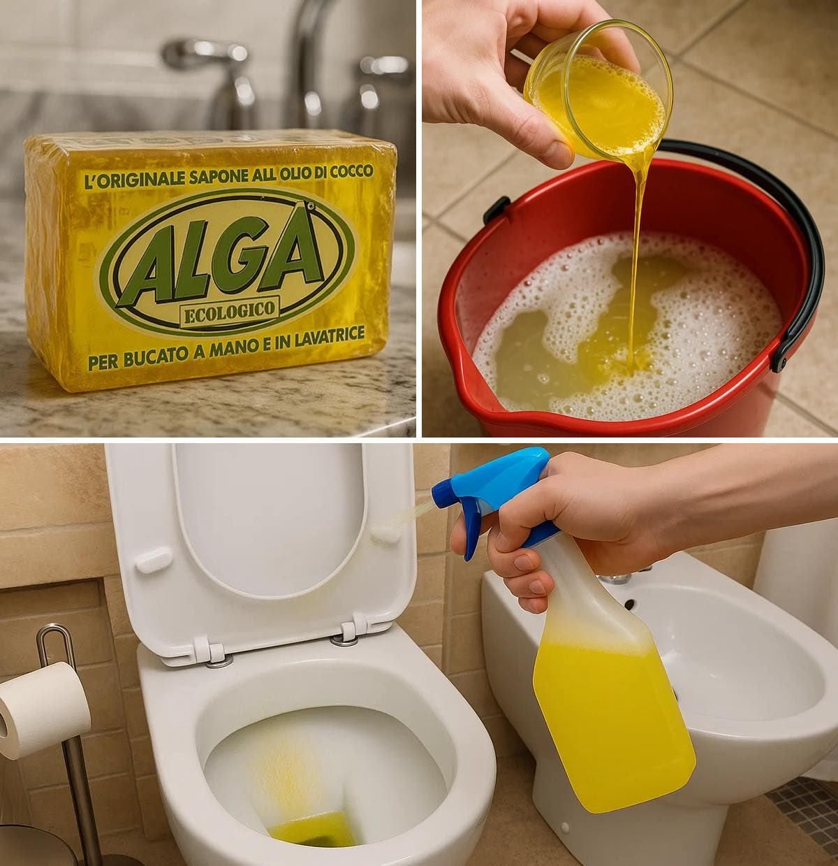 Il sapone giallo si prepara a partire dall’olio di cocco e lo si trova supermercato, quasi sempre di marca “Alga”, costa pochissimo e, come vedrai, è un prodotto estremamente versatile e utile nelle faccende domestiche.