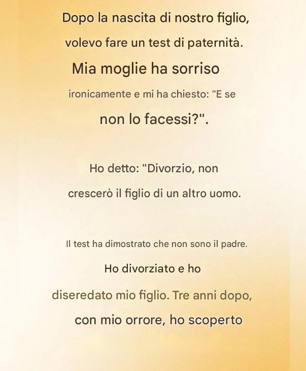 “Allora ti chiederò il divorzio”, dissi. “Non crescerò il figlio di un altro uomo.”
